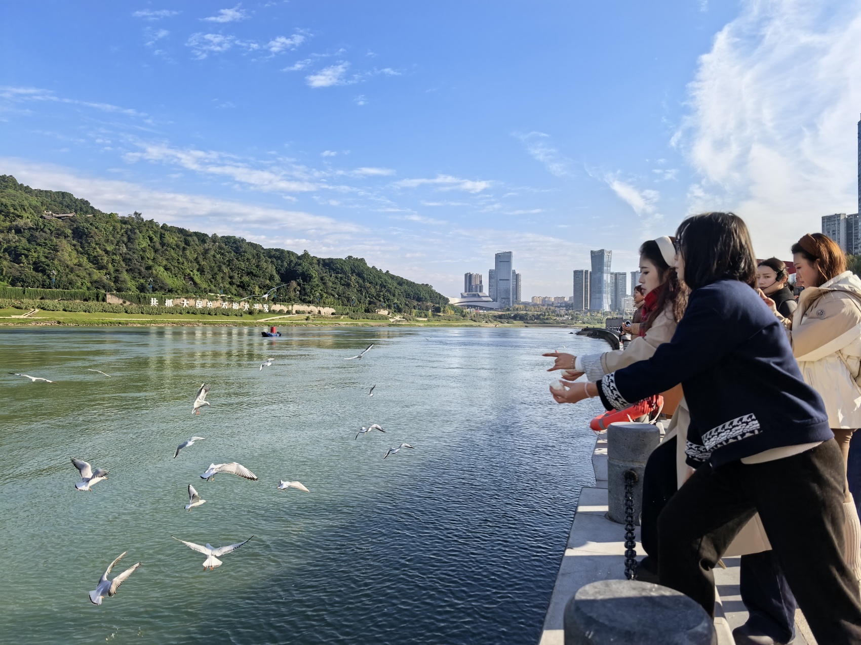 绿水绕城,鸥鸟翱翔。11月19日上午9点过,宜宾三江口“三江观鱼”点早已人头攒动,市民游客手持面包屑、鸥粮轻轻抛撒,从西伯利亚远道而来的红嘴鸥在阳光下争相觅食、自由盘旋。这幅人与自然和谐共生的鲜活画面,正是宜宾生态环境持续改善的生动缩影。