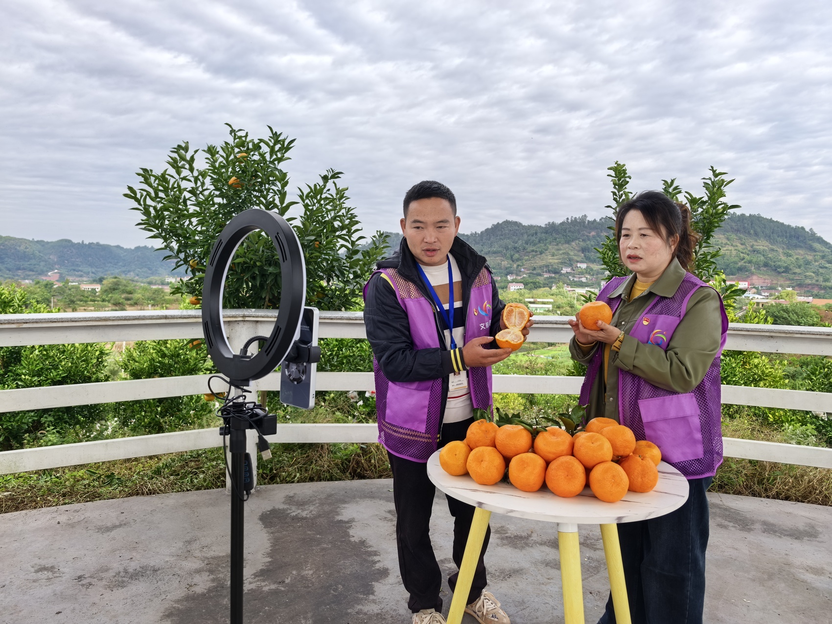 在柑橘种植基地里,志愿者正在进行“网络直播”(罗园 摄)